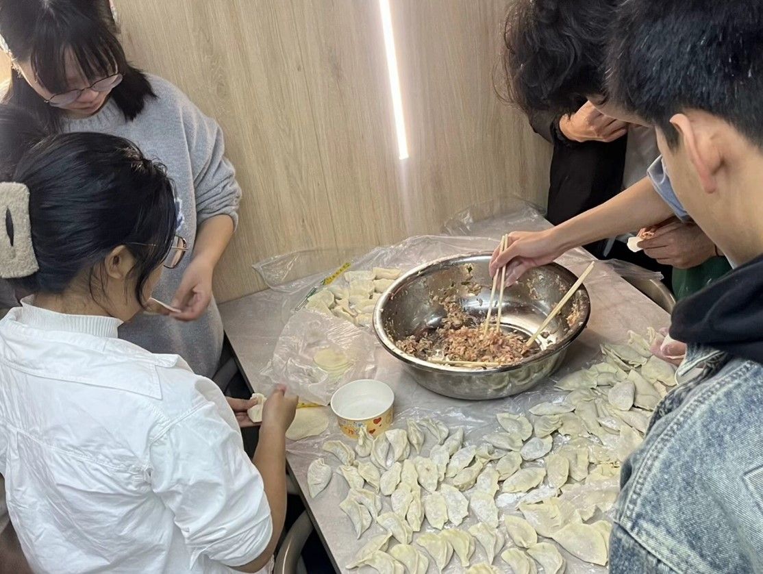 当日下午1530分,同学们满怀热情,齐聚在共享厨房外。活动伊始,同学们按照预先规划迅速分组,有条不紊地投入到食材准备工作中。洗菜组在水池边洗净蔬菜,去除泥沙;切菜组于案板上把土豆、胡萝卜等食材切成合适片状、丝状;生火组小心操作炉灶,成功点燃火焰,待锅中油冒烟,烹饪条件就绪。同时,还有一组同学专注于包饺子,他们围坐在大桌旁,面前摆放着面粉、鲜嫩的馅料,只见他们轻轻一折一捏,一个个形态各异却饱满的饺子便摆满了托盘。