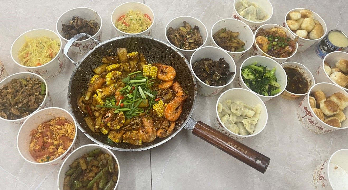 期间,各组同学默契配合,传递食材、互助协作,现场氛围活跃。两小时精心烹饪结束,同学们把一盘盘菜肴端上餐桌,有椒盐虾、薄荷炸排骨、酸辣土豆片、凉拌鸡丝与透着馅料色泽的饺子等等。同学们围坐在餐桌边,脸上带着完成烹饪的自豪,满心期待品尝成果。用餐时,同学们边吃边交流烹饪中的趣事,气氛温馨融洽。