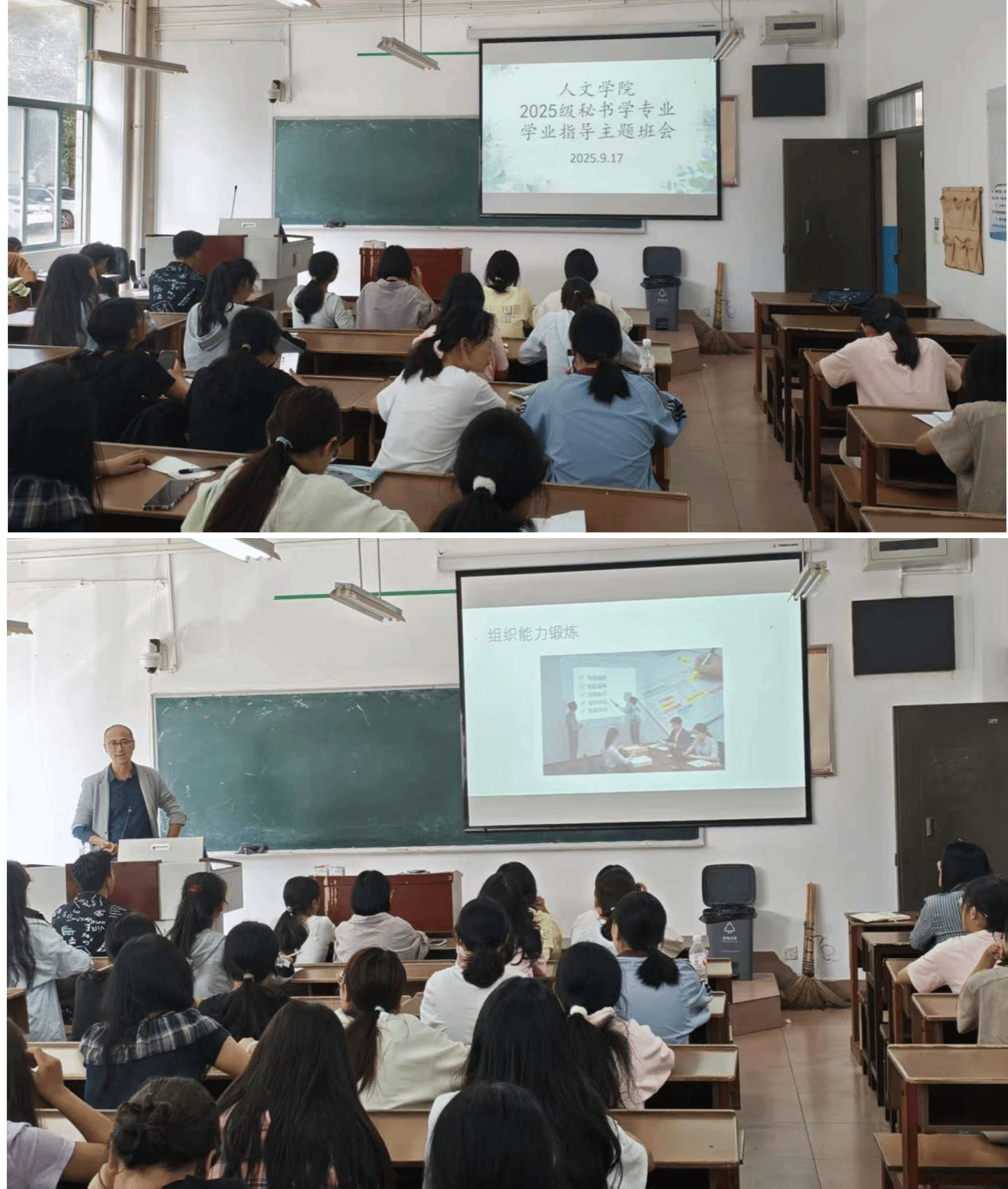 班会伊始,张宏勇书记首先通过高校招生与毕业生数据,结合秘书学专业特点,展示毕业生就业场景与“上岸”情况,剖析就业形势,明确专业发展;然后从思想与组织发展、专业技能提升、学业硬指标、毕业去向等多方面阐述大学期间能力培养重点,明确新生努力方向,规划大学路径。