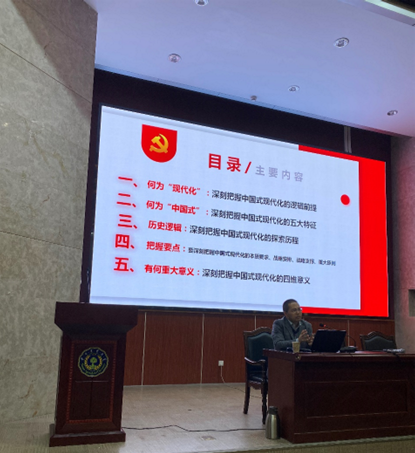 报告从习近平新时代中国特色社会主义思想体系构成入手,从世界文明史的维度具体分析了中国式现代化的所具有的各国现代化的一般性特征和中国式现代化的中国特色,在两个前置逻辑基础上,围绕百年党史的四个阶段分析了近代以来中国仁人志士对中国现代化的探索历程,重点阐释中国式现代化的本质要求、战略支撑和重大原则,最后从“四史”角度得出中国式现代化的实践意义。