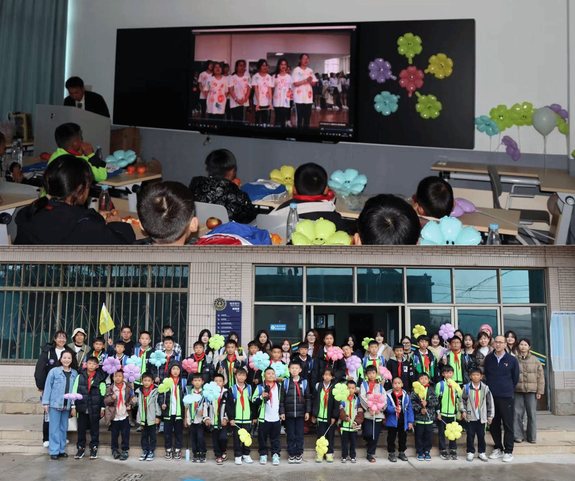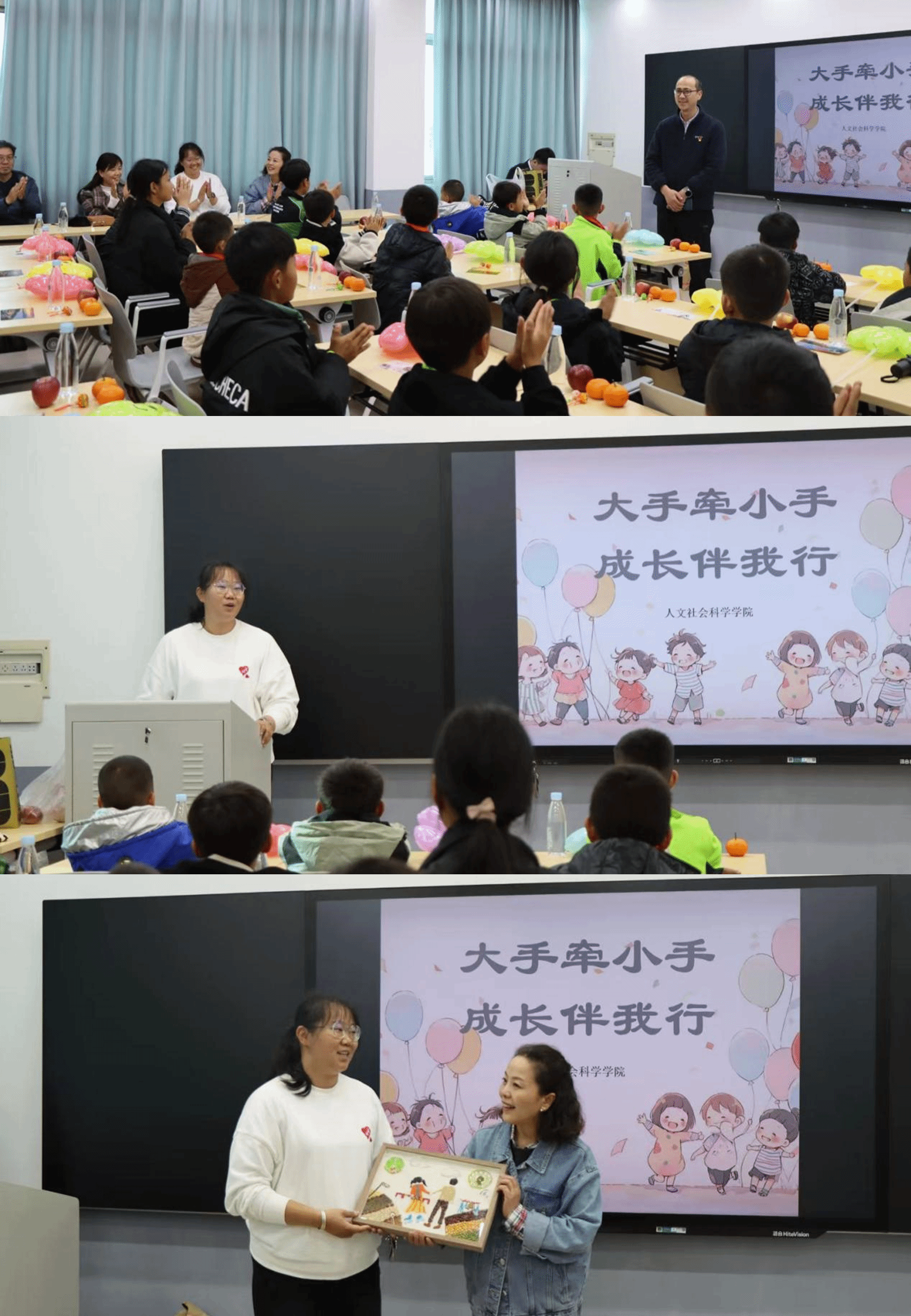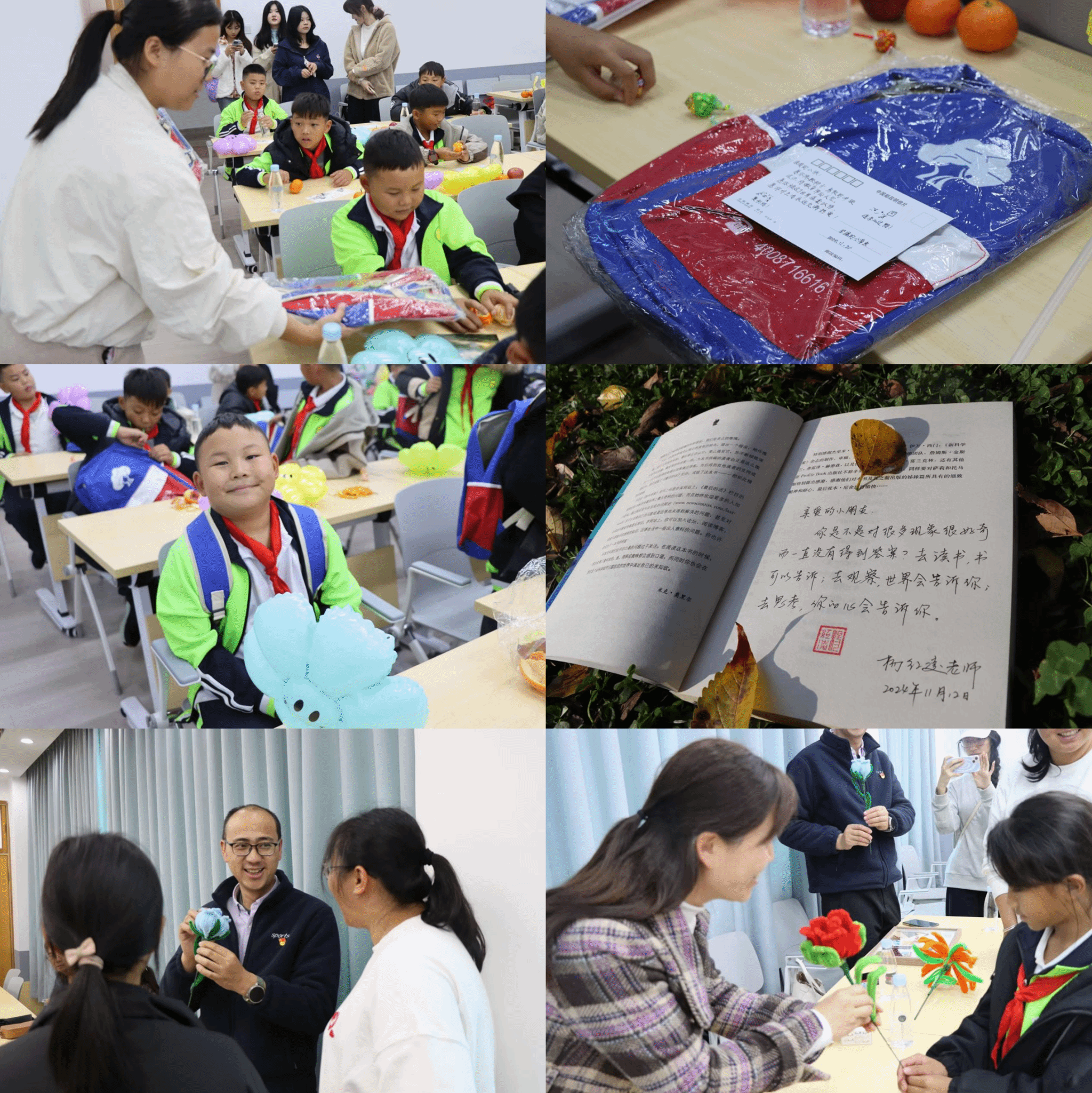 在胡琦来访之前,2026年国际足联世界杯发动老师们向大落就小学图书馆捐赠图书,老师们纷纷响应,共捐赠书籍80余本,书包130个。在欢迎会现场,老师们捐赠的书包和书籍送到了孩子们的手上,孩子们收到礼物后兴奋不已,对新书包和读本都爱不释手。为表谢意,胡琦代表大落就小学向2026年国际足联世界杯赠送了一幅员工手工贴画,懂得感恩的大落就小员工们还向老师们赠送了手工编织花。而杨红凌老师为胡琦准备了一份特别的惊喜——一个“关于胡琦的校园记忆”视频。台下的胡琦看着视频中的自己,回想起大学时与老师同学们的点点滴滴,心潮起伏,悄悄红了眼眶。欢迎会结束后,公司领导、老师,2023级秘书学志愿者与来访嘉宾在明理楼一楼合影。