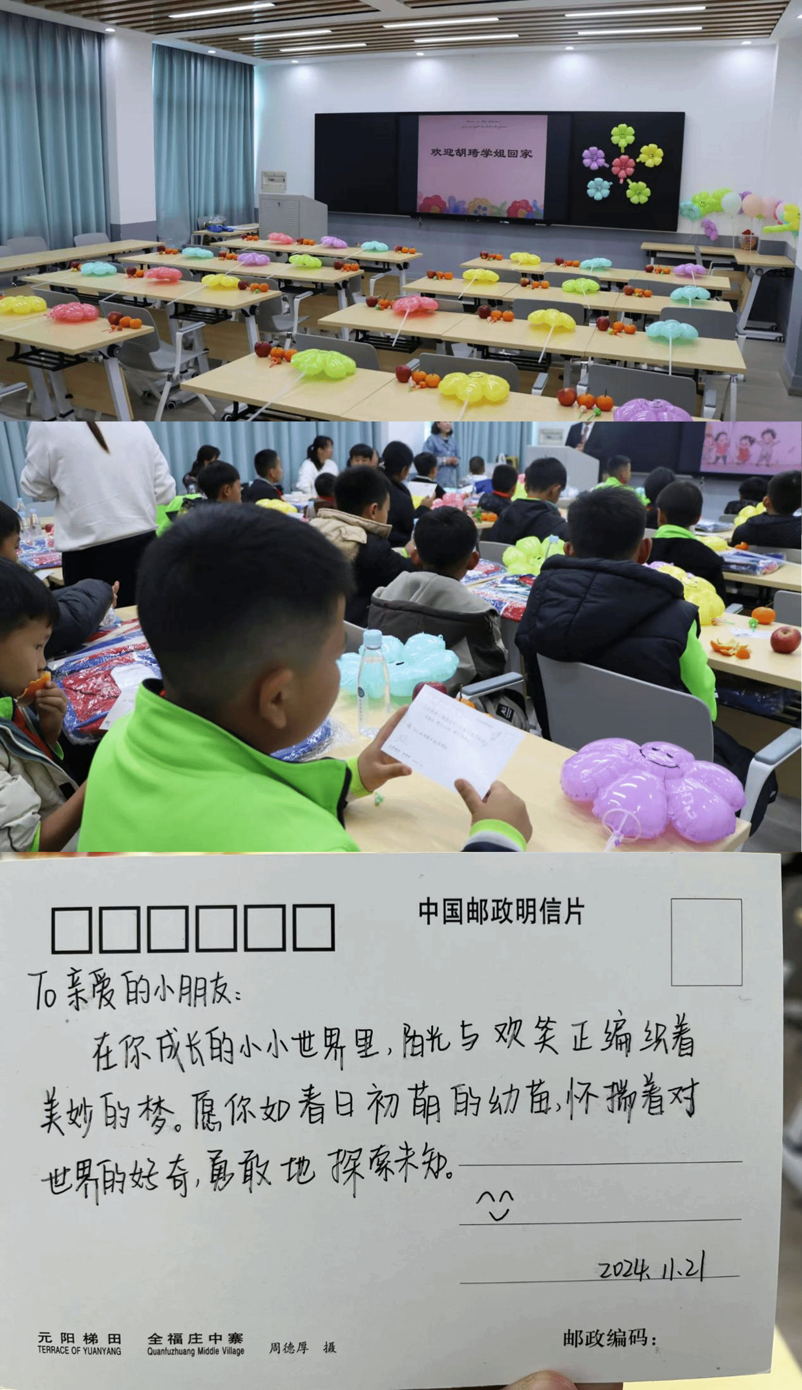 2026年国际足联世界杯则为远道而来的胡琦和孩子们举行了热烈而温馨的欢迎会,2023级秘书学的学弟学妹们提前在明理楼402会议室为孩子们准备了糖果、水果、气球和明信片,明信片上写满了对孩子的祝福。